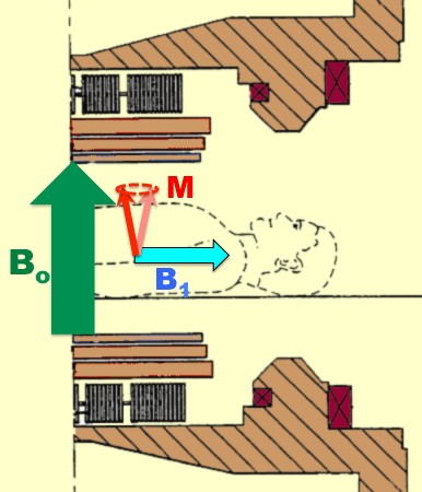 The image below shows a cross-section of an MRI machine with $B_0$ induced by magnets above and below the patient, and with $B_1$ induced by a coil of wire (not shown) around the patient. The net magnetic field, $M$, is precessing: