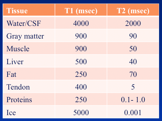 T1 is in [0.1, 3.0]. T1 is the time constant for the net magnetic moment, $M_z$, in the $B_0$ direction.