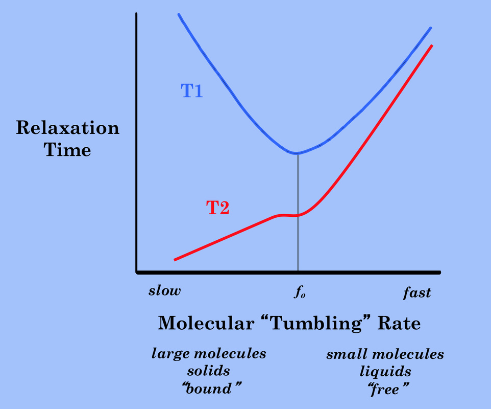 T1 and T2 depend on molecule containing the $^1H$. Small fast molecules have long T1 and T2. Slow molecules get shorter T2 and longer T1: