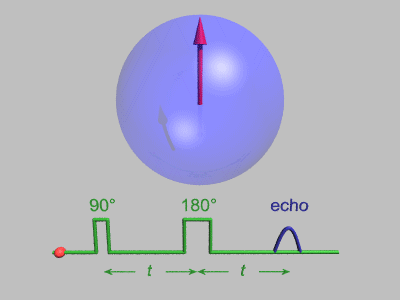 Adding another pulse to "flip" the magnetic moment by 180 degrees causes the individual to get back into phase, providing a strong signal at twice the pulse time.