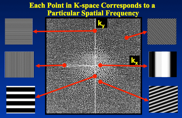 Recall that each point in the frequency domain (or "k-space" as it's called by MRI people) represents a sinusoidal wave in a particular direction with a particular frequency: